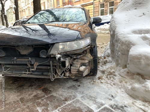 Broken car on the background of a snowdrift. Passenger car without front bumper. Concept: extreme driving in winter