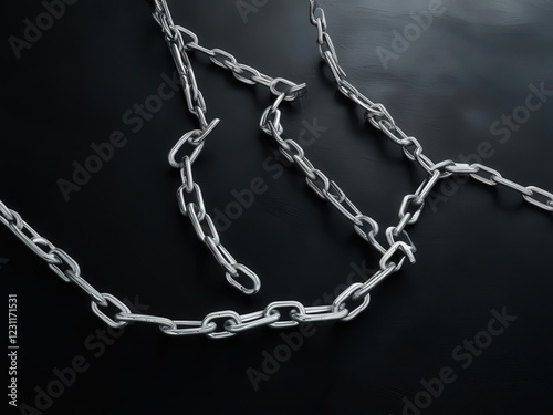 Broken Chains on Dark Surface: A close-up view of a silver chain, its links broken and scattered across a dark, mysterious surface. The image evokes a sense of fragility, vulnerability, and loss.