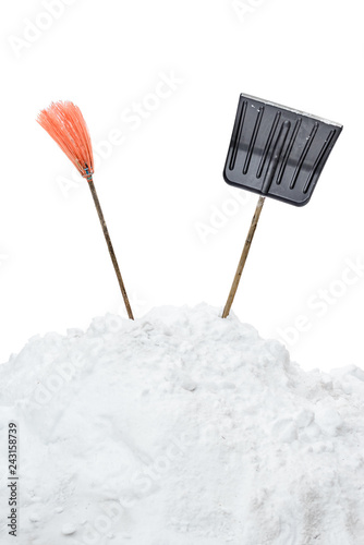 Broom and shovel sticking out of the snow. Isolate. Tools for snow removal.