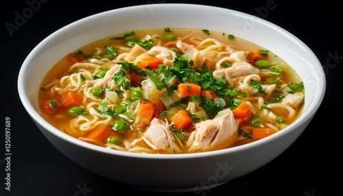 Broth tender chicken noodles vegetable hot spicy soup on black bowl