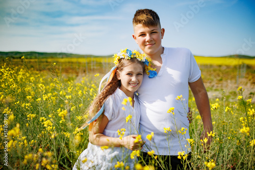 Brother hugs sister with Ukrainian wreath and bouquet of flowers in hands, in rapeseed field under sky
