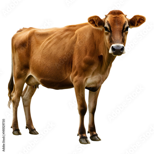 Brown cow standing tall, captured from the side in a stationary pose on a white background.