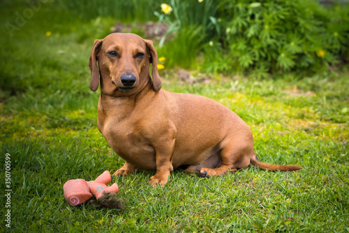 Brown dachshund dog of three years old is waiting for his owner on green field . Cute dog.
