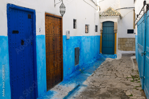 Brown door among blue doors in an alley of Oudaia Kasbah Rabat Morocco
