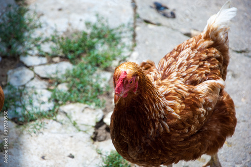 croatia, agriculture, alive, alley, animal, avian, beak, bird, brown, chicken, closeup, closeup, cock, concrete, country, countryside, crest, domestic, domesticated, ecological, environment, farm, farming, farmyard, fauna, feather, feathered, female, fowl, hen, farm animal, meat, natural, nature, outside, poultry, red, rural, scene, single, summer, village, yard