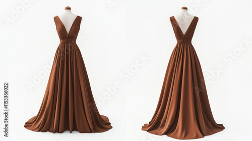 Brown formal dress mockup front and back view isolated on white background for brand presentation