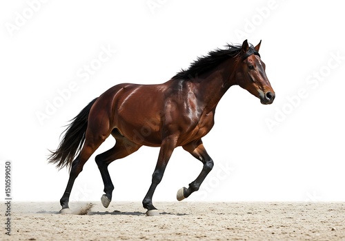 Brown horse galloping isolated on white background in a sandy area