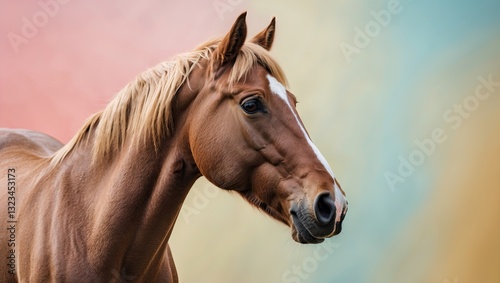 Brown horse with a sleek mane positioned left, set against a soft pastel background of blue and peach tones, emphasizing its natural elegance.