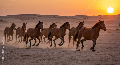 Brown Horses Running Together Across the Sandy Desert Horizon PNG