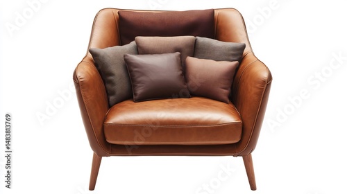 Brown leather armchair modern cushion arrangement top down perspective isolated on white background