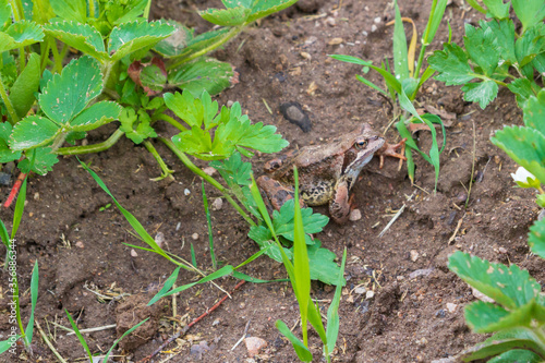 Brown spotted frog walks in the garden in summer.