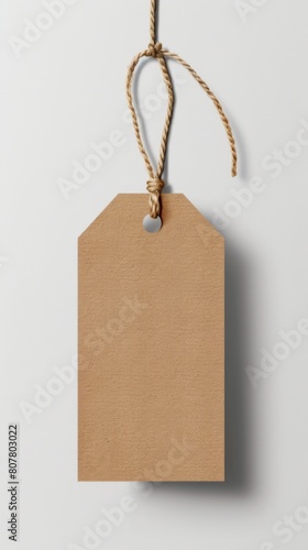 Brown tag hanging on a string on a white wall. Mockup background . Vertical background
