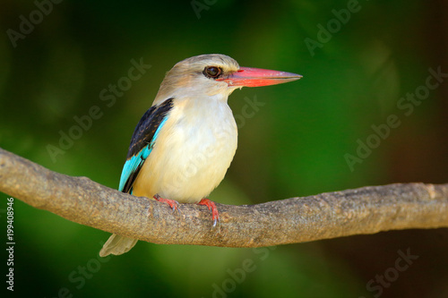 Brown-hooded Kingfisher, Halcyon albiventris, detail of exotic African bird sitting on the branch in the green nature habitat, Chobe river, Botswana, Africa. Wildlife scene form nature.