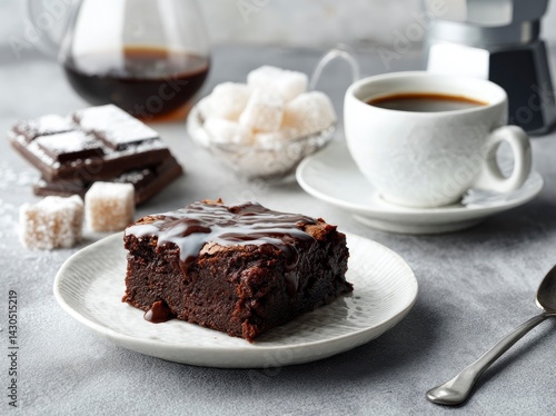 brownie, eat, chocolate, white, dark, sauce, plate, hot drink, spoon, drink, sugar, sweet, square, baked, tasty, studio, clean, indoor, table, background, day, food, dessert, morning, snack, breakfast, lunch, dish, pastry, caffeine, cup, sweetener, powder, coffeepot, maker, angle, still life, refreshment, indulgence, treat, serving, consumption