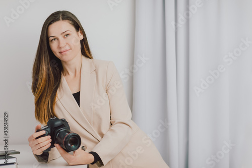 camera, woman, photographer, photo, young, photo, beautiful, isolated, digital, lens, white, portrait, holding, person, photograph, people, business, face, smiling, beauty, equipment, binocular, picture, taking, studio