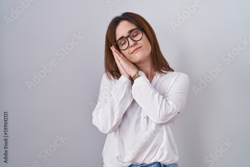 Brunette woman standing over white isolated background sleeping tired dreaming and posing with hands together while smiling with closed eyes.