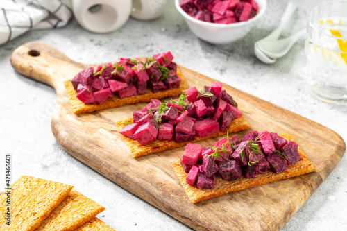 Bruschetta with pickled beet, apple and mayonnaise. Sandwich or crostini on a serving wooden board on a light gray table. Crusty bread with traditional Scandinavian beetroot salad