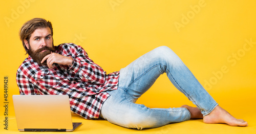 brutal bearded man wear checkered shirt having lush beard and moustache working on laptop, business