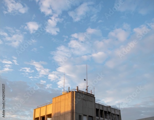 building, concrete, beige, facades, architecture, sky, cloud, sunset, light, shadow, exterior, daylight, panel, structure, modern, urban, light blue, partially, cloudy, window, square, panel, geometric, horizon, low angle, view, empty, still, calm, peaceful, blue, white, fluffy, cumulus, cirrus, altocumulus, cloudscape, weather, atmosphere, atmospheric, sunlight, sun