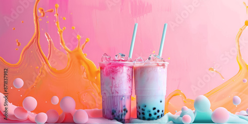 Bubble tea in plastic cups, plain pink background, summer boba beverage, colorful milk splashing, iced nai cha drink, tapioca in transparent glass, bright splash, pearl milk tea assortment copy space