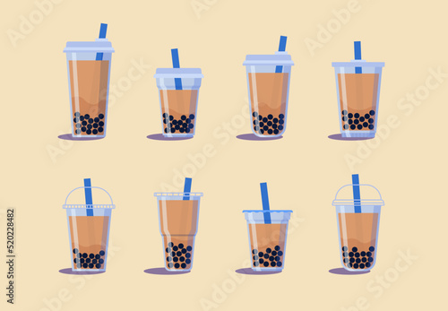 Bubble Tea Set. Boba Brown Sugar Flavored Tea, Different Sizes. Flat Vector Illustration.