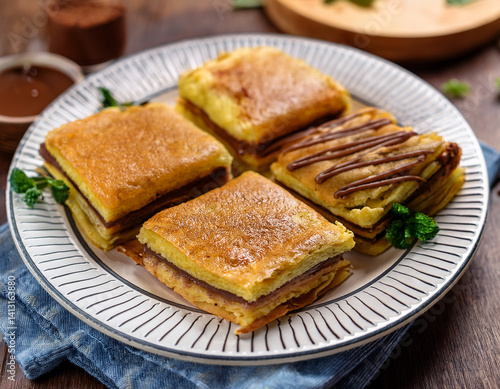 Bubbling and sweet Indonesian Martabak Manis (sweet thick pancake) with various fillings like chocolate and cheese, showcasing a popular dessert.