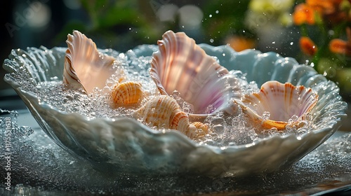 shell, water, bubbling, seashell, kitchen, coastal, photo, visual, serene, inspire, unique, sparkling, moment, element, inspiration, relaxing, tranquil, atmosphere, vibrant, marin, soft, setting, sharpened, sunlight, cosy