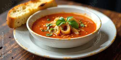 spicey, presentation, steamy, ceramic, soup, hot, texture, aroma, bubbly, favor, savoury, bread, plate, colours