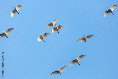 Bubulcus ibis. View from below of cattle egrets in flight. Province of Leon, Spain.