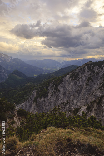 mountain, countryside, heaven, nature, panorama, cloud, vale, view, hill, blue, travel, rock, green, forest, summer, peak, alpen, outdoors, high, tree