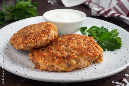 Buckwheat cutlets with cheese and parsley on a plate. Healthy diet food
