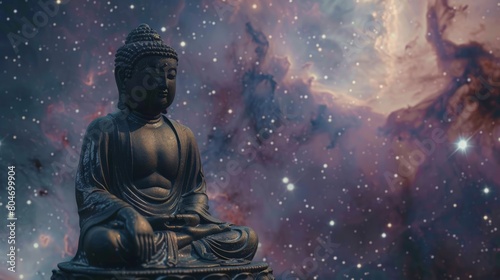 Buddha statue in cosmic backdrop, meditating amidst stars, representing enlightenment and the universe. Perfect for conceptual art.