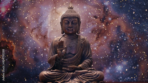 Buddha statue in cosmic backdrop, meditating amidst stars, representing enlightenment and the universe. Perfect for conceptual art.