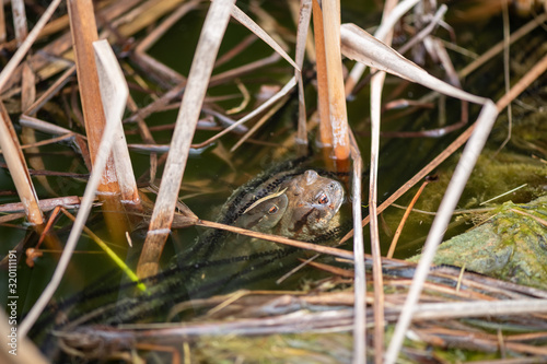 Bufo bufo or Common Toads mating in a pond during the reproductive season with long strings of eggs in the water and around them