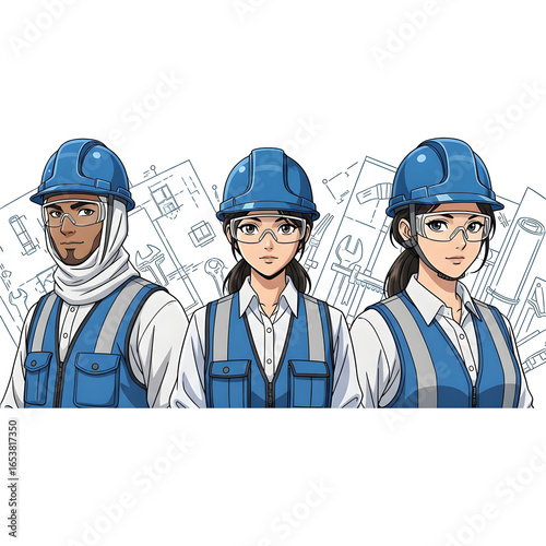 Builders dressed in protective vests and helmets. Construction worker character. Cartoon illustration.