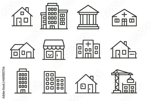 building, icon, house, line, vector, set, real estate, construction, architecture, home, city, urban, simple, symbol, pictogram, apartment, hospital, bank, store, office, outline, signs, graphic, design, business, property, collection, illustration, linear, modern, minimalist, structure, residential, commercial, facades, clinic, shop, crane, skyscraper, town, exterior
