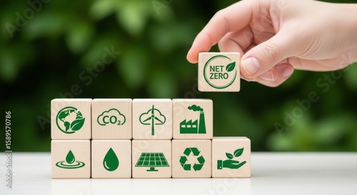net, zero, sustainability, environment, eco, friendly, green, energy, climate, change, carbon, footprint, renewable, ecology, conservation, earth, wind, turbine, factory, water, dripped, solar, panel, reusing, hand, leaf, block, cube, icon, symbol, future, growth, nature, clean