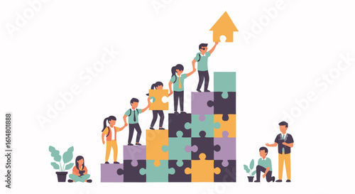 Building Dreams: A collaborative illustration of individuals, working as a team and assembling a jigsaw puzzle, aiming toward a common goal. Reflecting the shared journey toward achievement.
