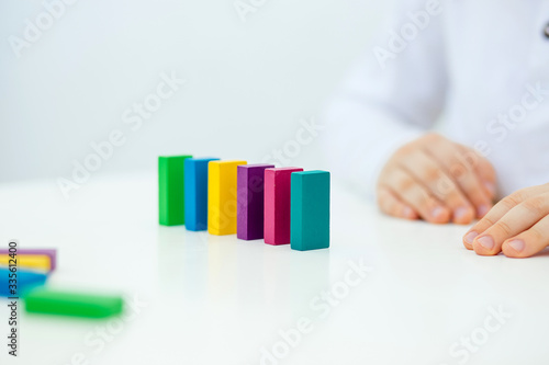 Building items in a single row. Concept of diagnostics of children's autism. A child plays with a colored wooden construction tool. Close.