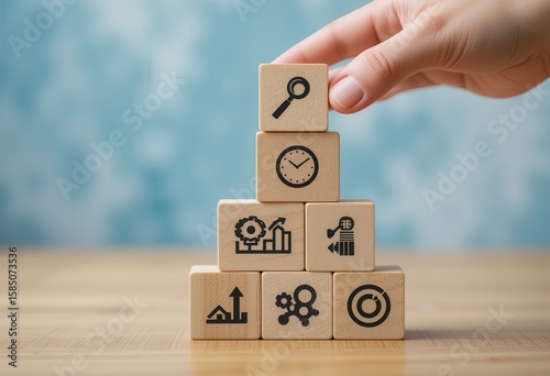 business, strategy, management, planning, innovation, time, progress, solution, teamwork, development, block, wooden, icon, hand, building, arranging, organisation, concept, growth, process, searching, clock, cogwheel, target, magnifying, glasses, analysis, technology, symbol, chart, datum, project, resource, opportunity, support, design, structure, corporate, creativity, decision, leadership, performance, achievement, productivity