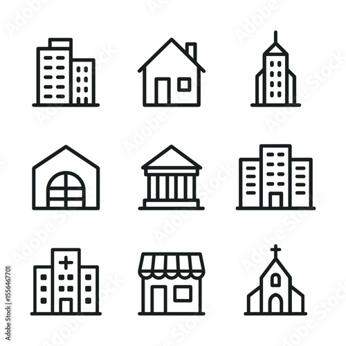 icon, building, line, architecture, construction, house, home, office, skyscraper, tower, structure, residential, commercial, apartment, hotel, hospital, school, factory, warehouse, vector, signs, symbol, outline, black, linear, church, bank, mall, shop, store, urban, city, property, estate, blueprint, plan, contractor, engineer, infrastructure, facades, roof, window, door, brick, concrete, real, building