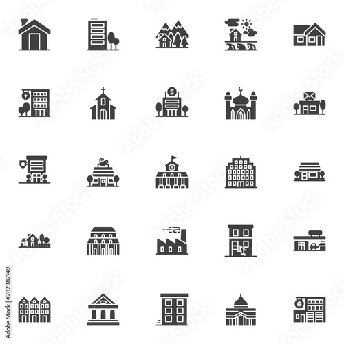 Buildings vector icons set, modern solid symbol collection filled style pictogram pack. Signs, logo illustration. Set includes icons as home, house, fire station building, police building, post office