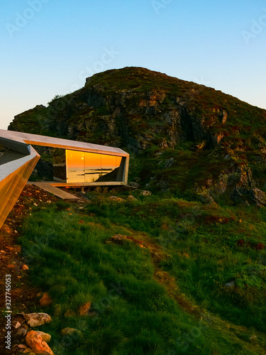 coast, viewpoint, rest, viewing, point, lookout, parking, area, place, architecture, privies, site, norge, norge, lofoten, holiday, trip, travel, attraction, journey, mirror, architectural, glasses, reflect, midnight sun