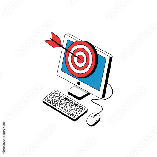 target, arrow, bullseye, computer, desktop, keyboard, mouse, success, achievement, goal, objective, aim, strategy, planning, business, technology, website, cyberspace, web, online, computer-screen, monitor, graphic design, isometric, illustration, vector, icon, growth, productivity, efficiency, result, accomplishment, achieving, engagement, conversion