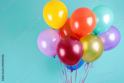 Bunch of bright colorful balloons against blue background. Air-filled rubber balls in various colors, ready for party celebration. Balloons floating, flying, joyful, cheerful, festive atmosphere.