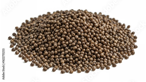 Bunch of garlic chive seeds set for planting indoors or outdoors. Commonly named Chinese chives, Oriental garlic, and Allium tuberosum. Selectively focused against a white background.