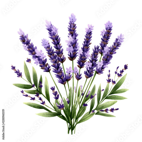 Bunch of lavender flowers in full bloom with green foliage on a sunny day in a natural outdoor setting isolated on transparent background..