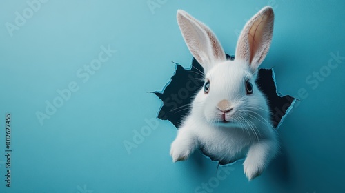 Bunny peeking out of a hole in blue wall, fluffy eared bunny easter bunny banner, rabbit jump out torn hole, Generative AI