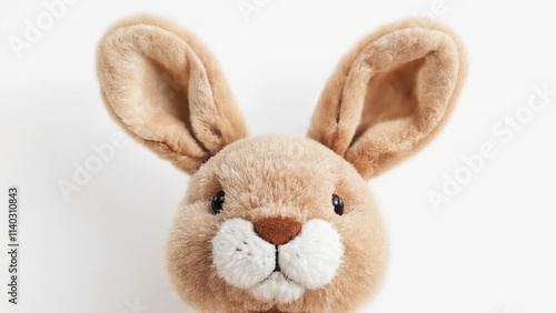 Bunny Plush Close-Up: A minimalistic composition featuring the top half of a simple, white plush bunny’s face, with its soft, round ears centered against a clean, white background