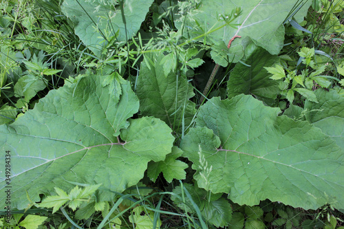 Burdock huge green leaves in spring forest. Medicinal plant Arctium in herbal garden. Top view